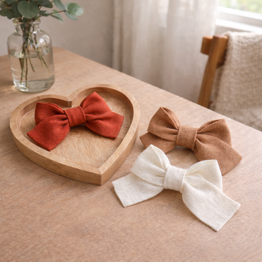 O Kit Laços Canela reúne três laços de linho misto nas cores terracota, café com leite e branco — uma combinação elegante e atemporal inspirada nos tons quentes da natureza.