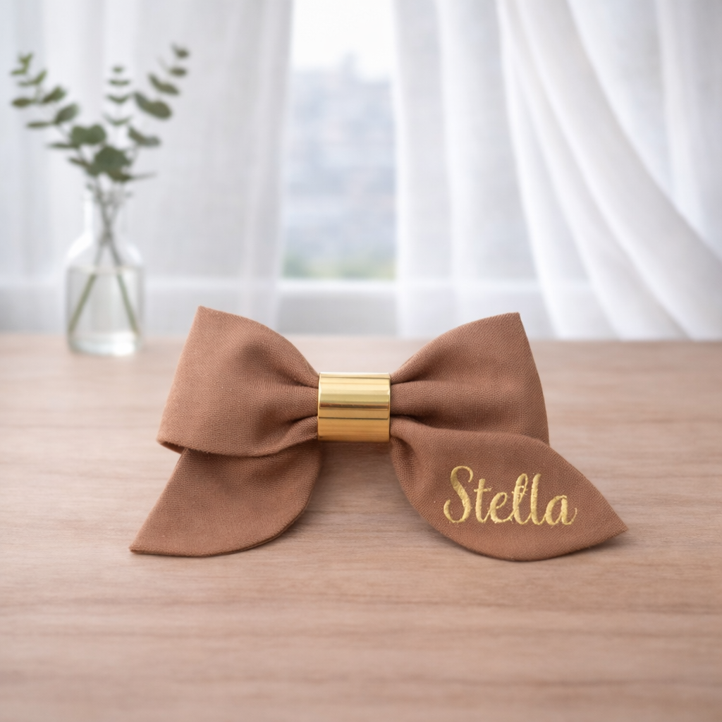 O Laço Personalité é o nosso modelo dedicado à exclusividade. Com a aplicação do nome em filme de recorte dourado sobre o linho ou a tricoline, ele transforma um acessório em uma recordação eterna. Perfeito para saídas de maternidade, aniversários ou para presentear com um toque de afeto personalizado.